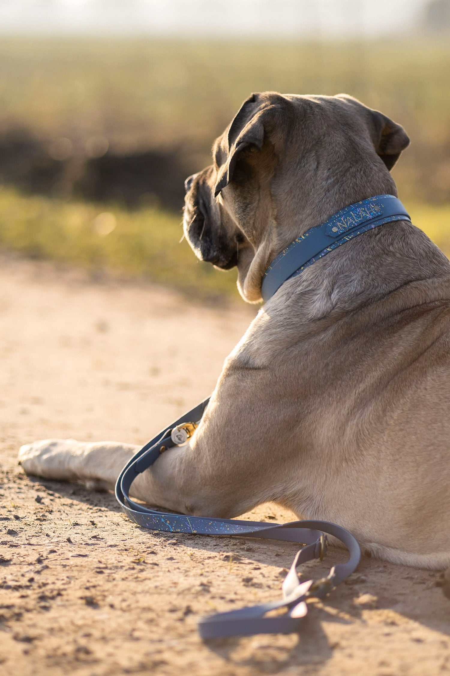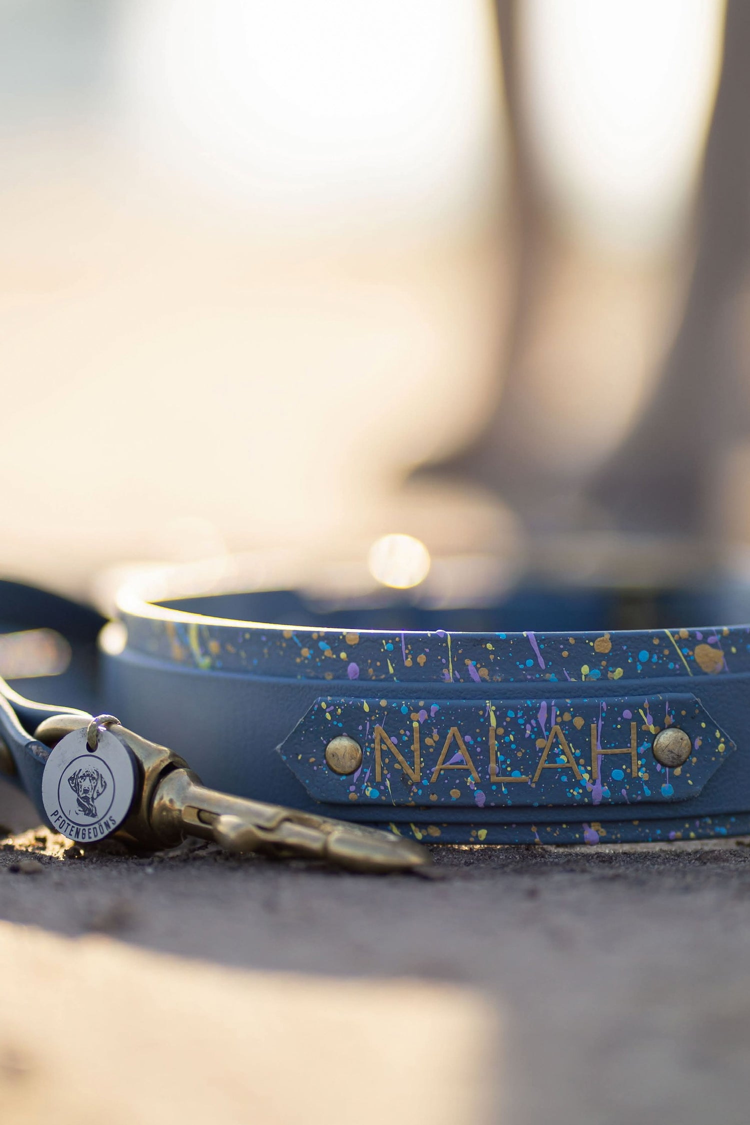 Das doppeltgelegte BioThane Halsband "Petrol" in der Grundfarbe Petrolblau ist mit Farbkleksen in den Farben Lilac, Hellblau, Gelb und Gold versehen.