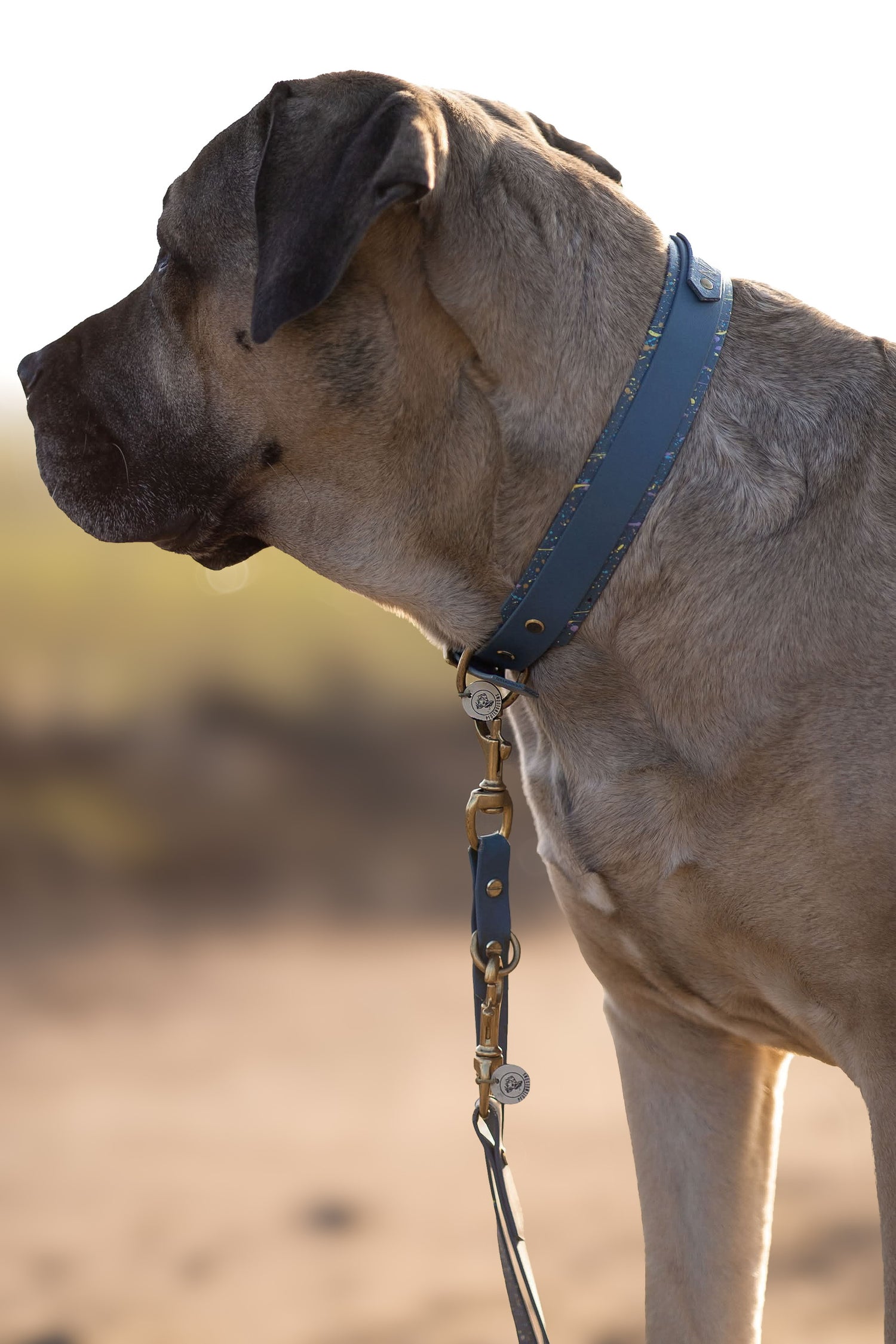 Die passende Leine ist 210cm lang, 19mm breit und dreifach verstellbar.